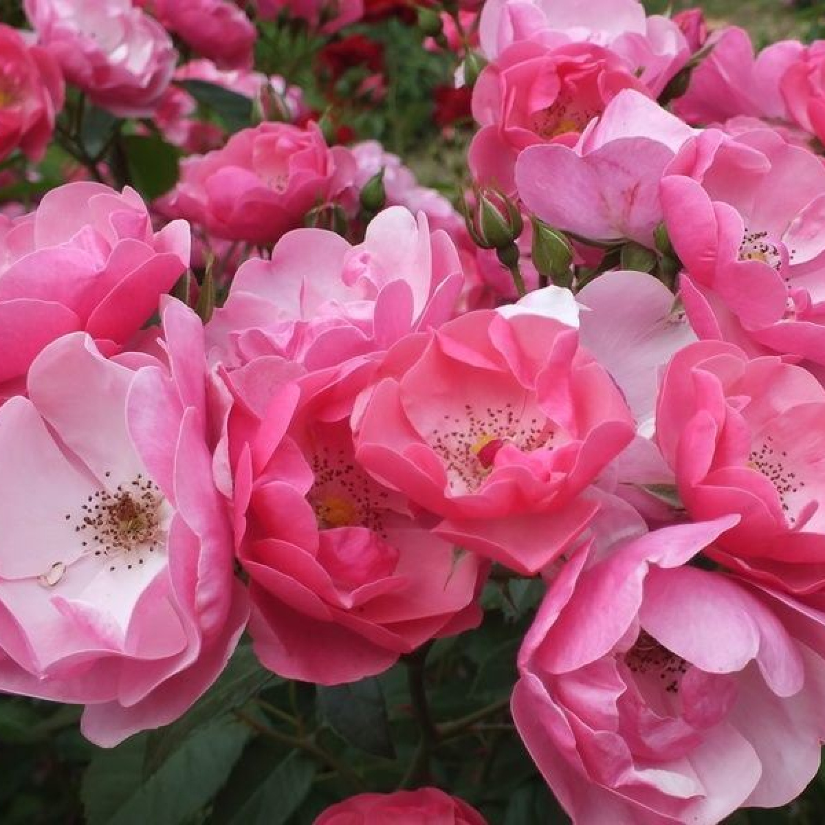 Высота: 100-150 см. Цветки шаровидные, мелкие, средне махровые, светло-розовые с малиновым реверсом. Аромат фруктовый. Флорибунда. Непрерывноцветущая.