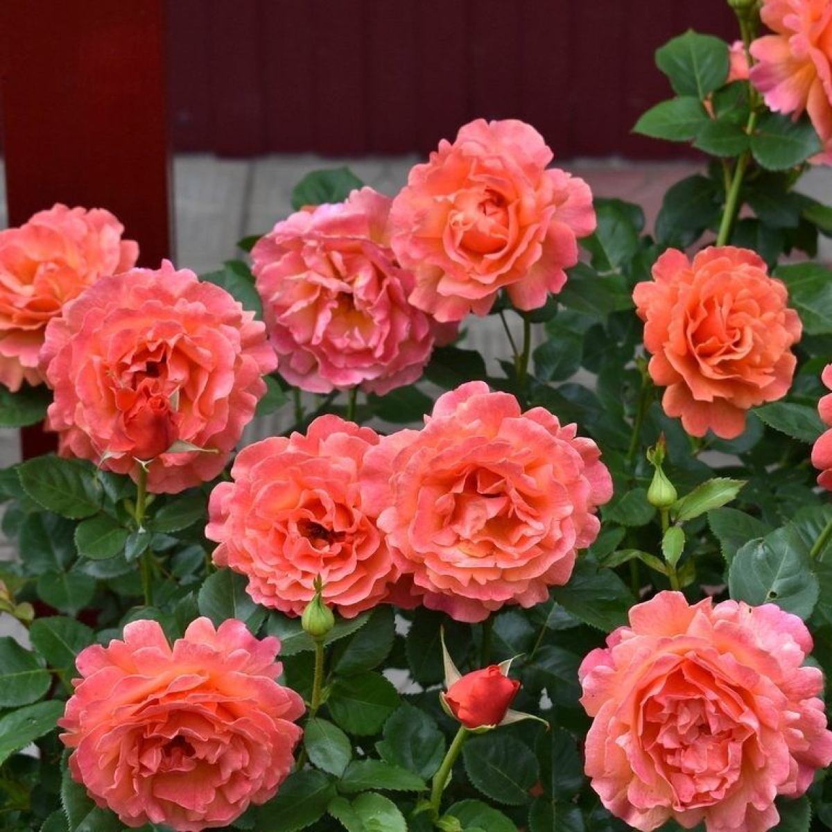 Высота: 70-90 см. Цветки крупные, махровые с резными лепестками, оранжево-красные. Аромат сильный. Флорибунда. Непрерывноцветущая.