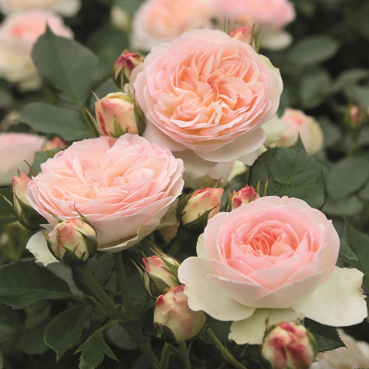 НОВИНКА!!! Высота:  60-70 см. Цветки густомахровые, кремовые с розовым налетом по краям. Аромат легкий. Флорибунда. Повторноцветущая.