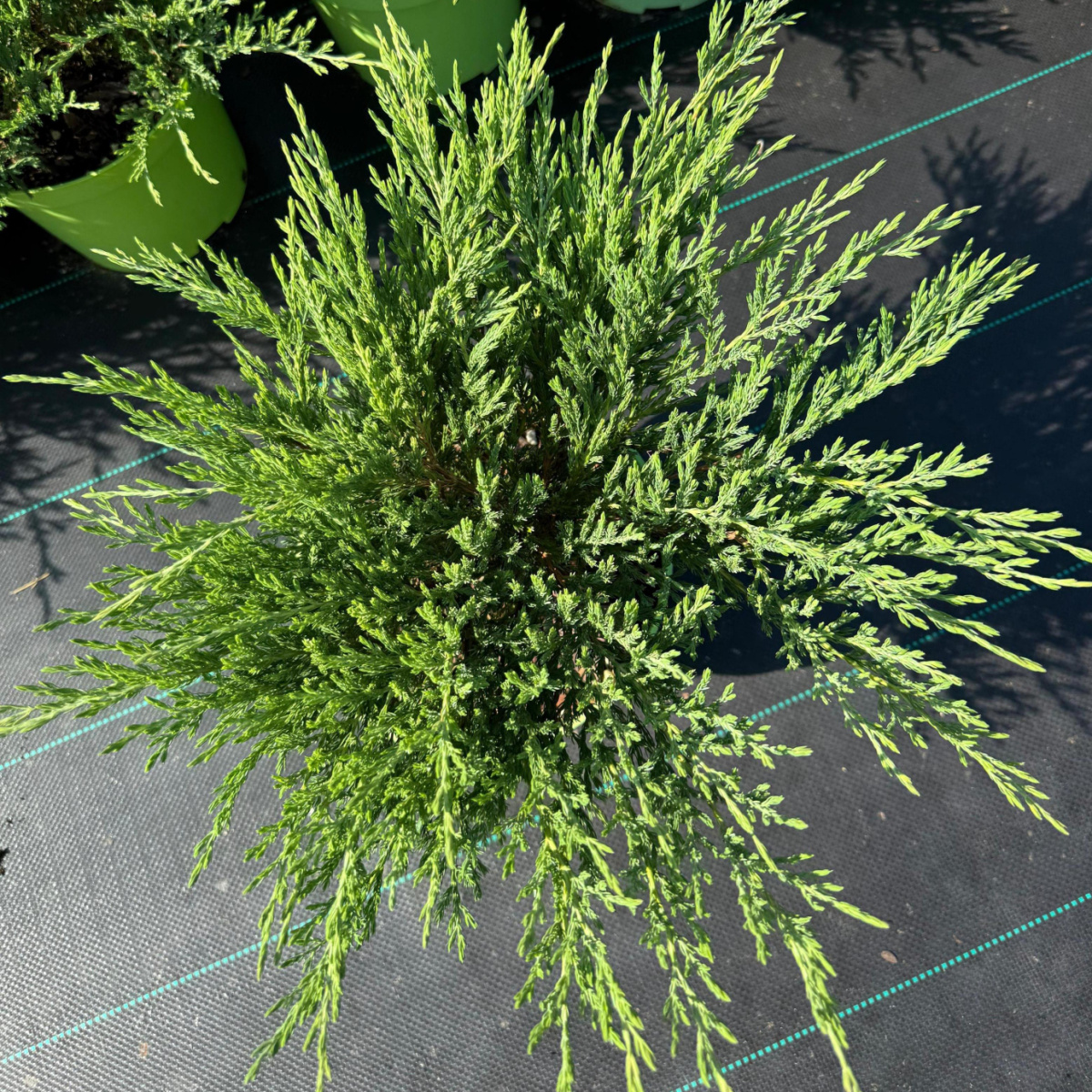 Широкий раскидистый кустарник с густой кроной, высотой до 0,4 м и диаметром кроны до 2,5 м. Ветви толстые, сильно ветвящиеся, растут под углом вверх, затем под своей тяжестью ложатся на землю. Хвоя зелёная, тонкая чешуевидная, короткая, колючая. Зимой хвоя фиолетово-красная. Один из самых быстрорастущих почвопокровных можжевельников. Солнце.