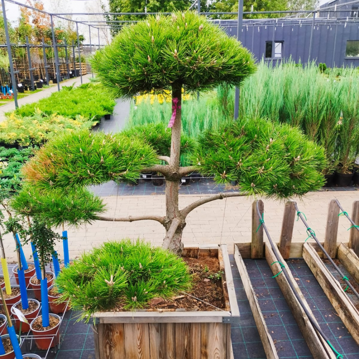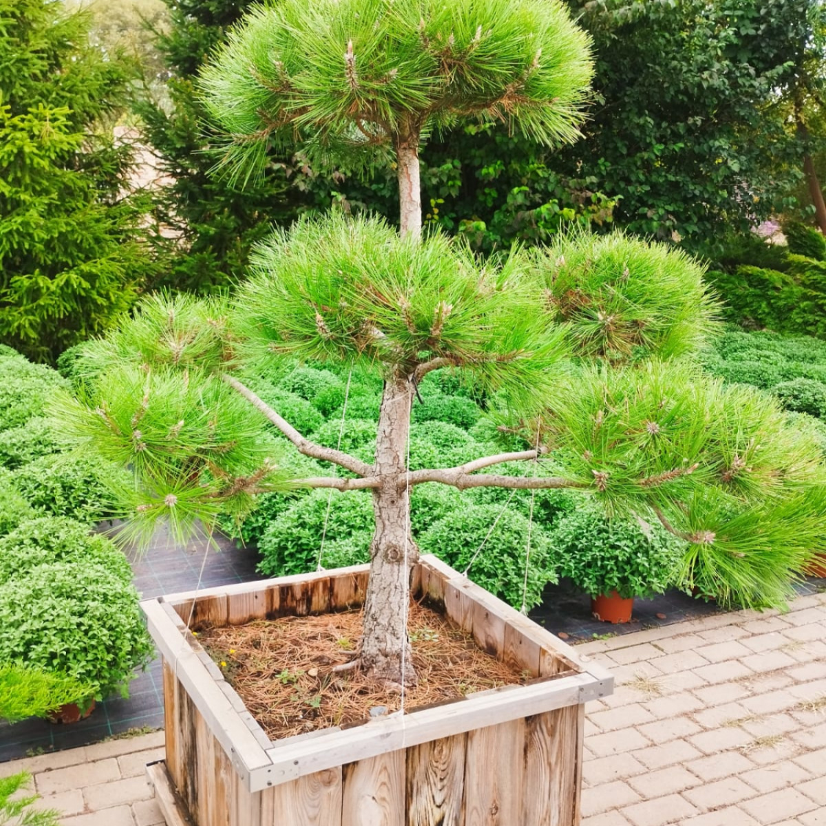 В японских садах деревьям придают определенную форму, регулярно их подстригают. Такие сформированные садовые деревья называются БОНСАЙ или НИВАКИ. Сформированные бонсаи требуют 1-2 поддерживающих форму стрижки в год. Бонсай из сосны черной(австрийской).Солнце.