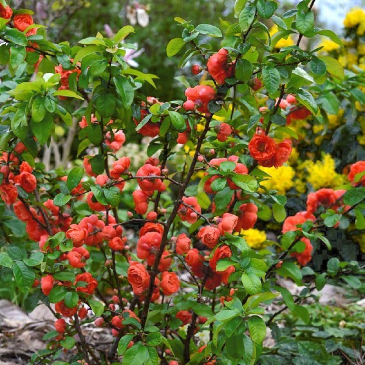Карликовый кустарник до 0,9-1,2м высотой и столько же в диаметре. Цветы махровые, красно-оранжевые, крупные! Солнце, полутень.