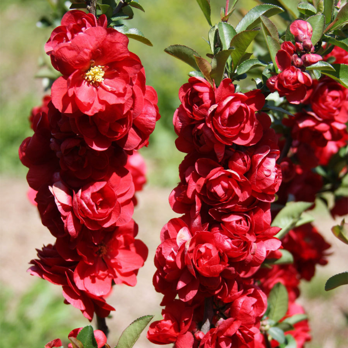 Кустарник до 0,9-1,2м высотой и столько же в диаметре. Цветы махровые, ярко- красные , крупные! Солнце, полутень.