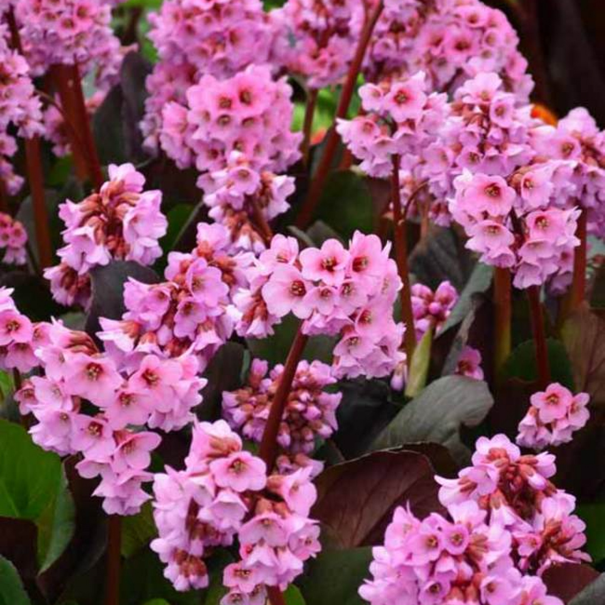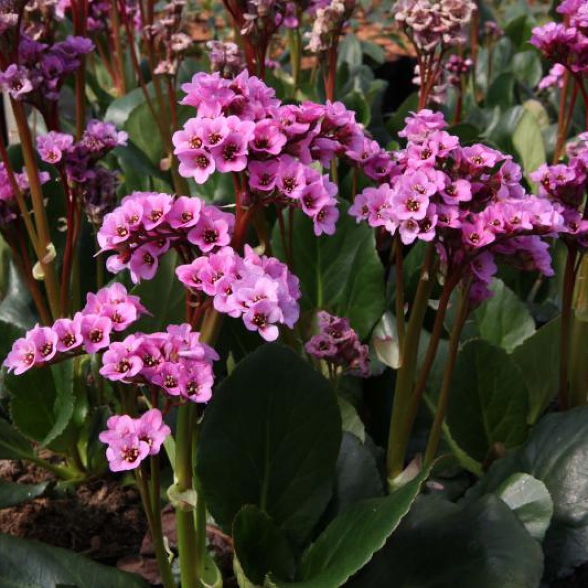 Высота и диаметр до 30см. Цветки крупные, ярко-розовые на толстых красных цветоносах. Цветение апрель-май. Тень, полутень.