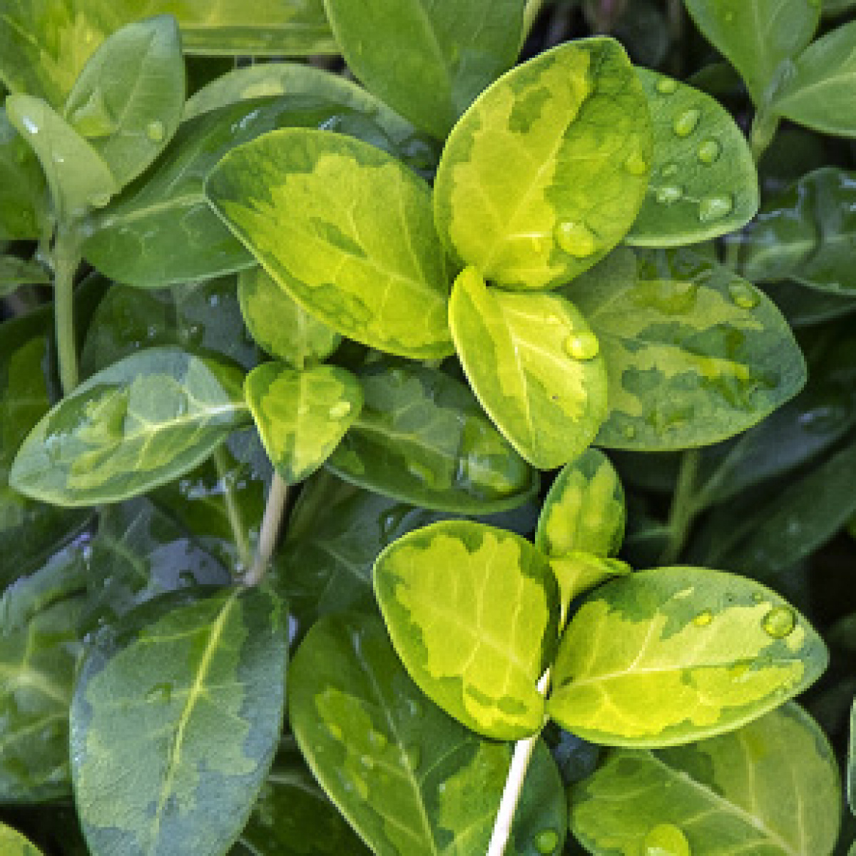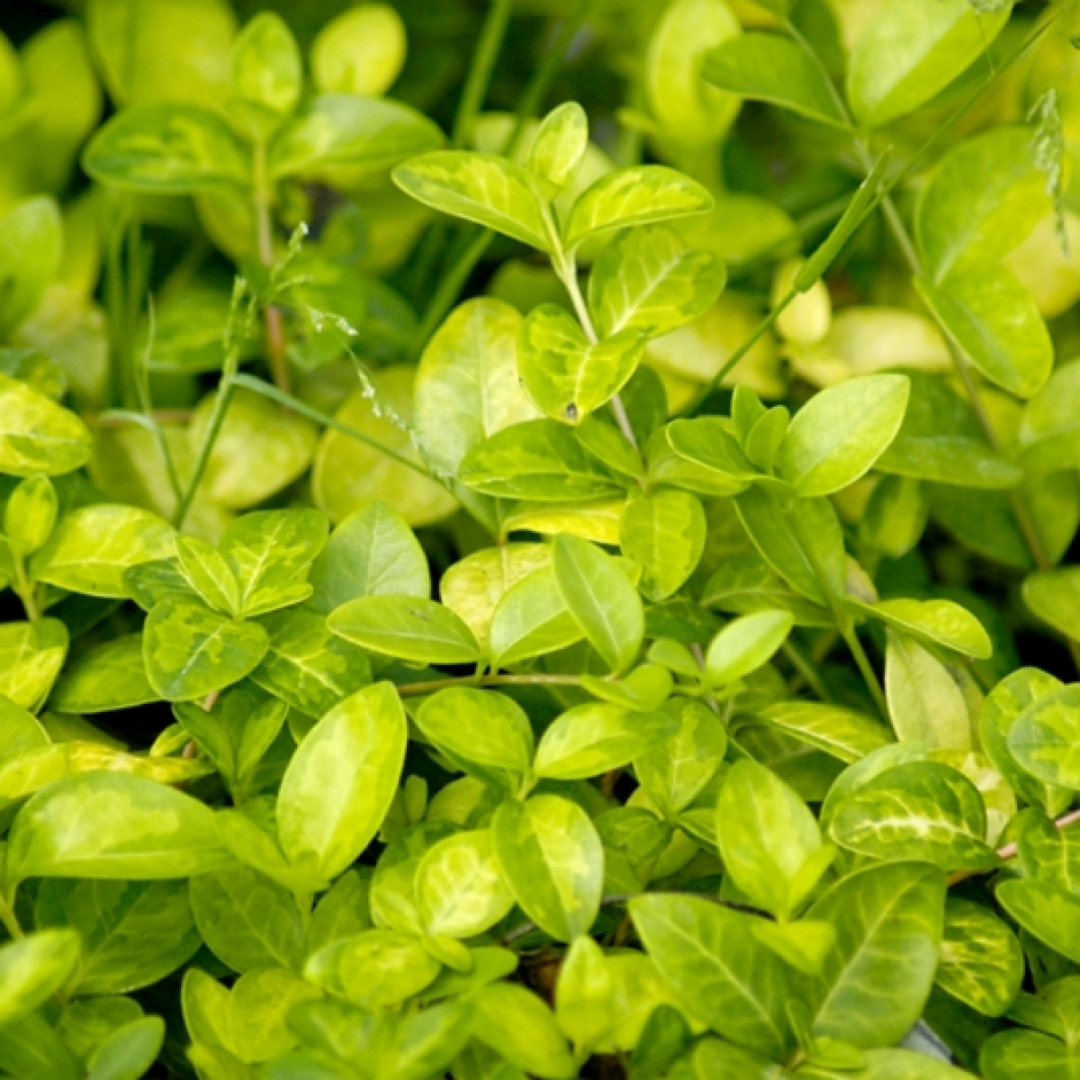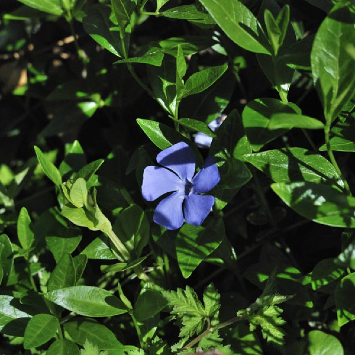 Почвопокровное растение. Высота 10-15 см. Разрастается до 80см. Листья кожистые, блестящие, светло-зеленые с бело-желтыми пятнами. Цветки голубые. Цветет май-июнь. Тень.