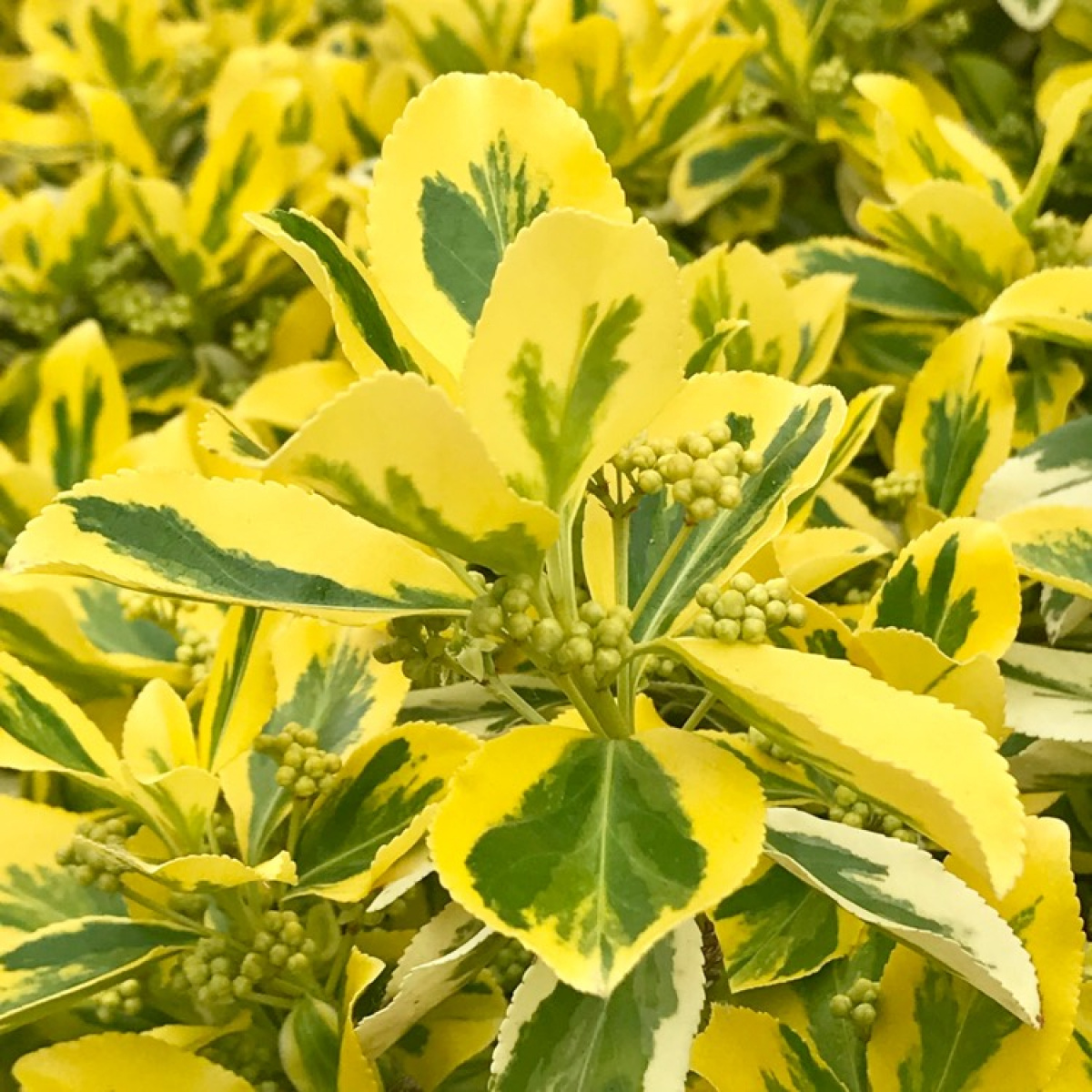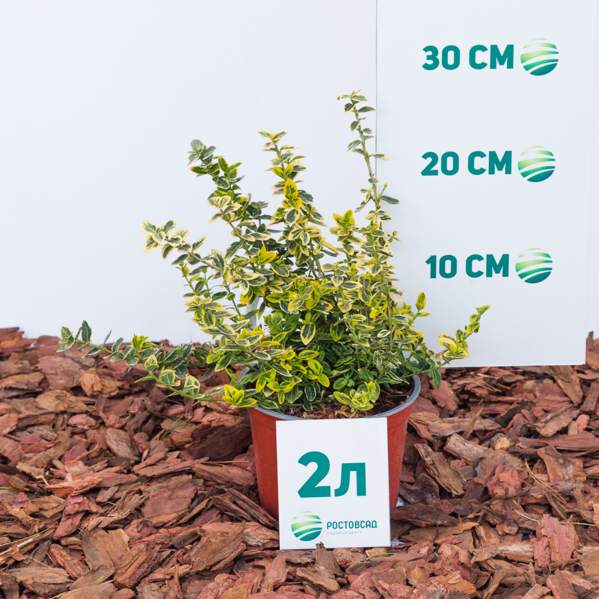 Карликовый рост до 0,4м. Вечнозелёный низкий кустарник со стелющимися побегами. Листья тёмно-зелёные с  жёлтой каймой. Солнце, полутень..