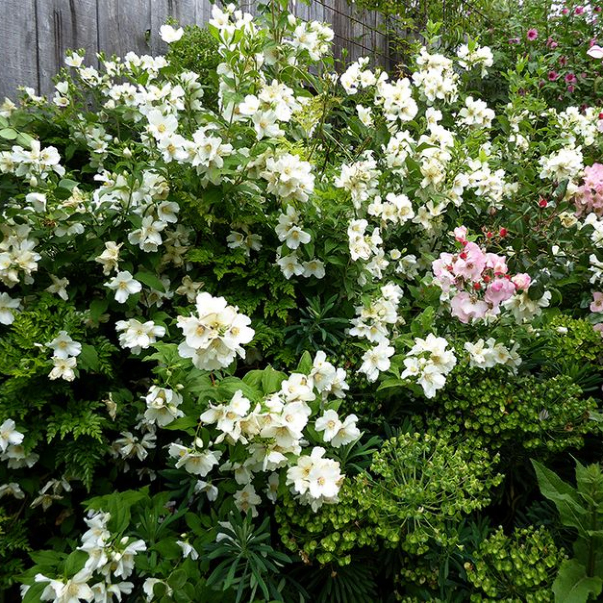 Куст высотой до 1-1,5м. Форма кустовая, раскидистая. Цветы белые, собранны в группы. Цветение обильное продолжительное  июнь-июль. Цветки белые крупные с розовым центором. Края лепестков бахромчатые. Солнце, полутень