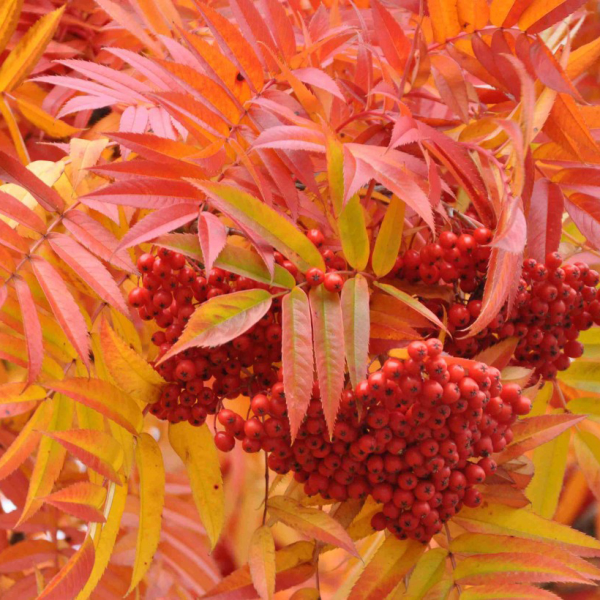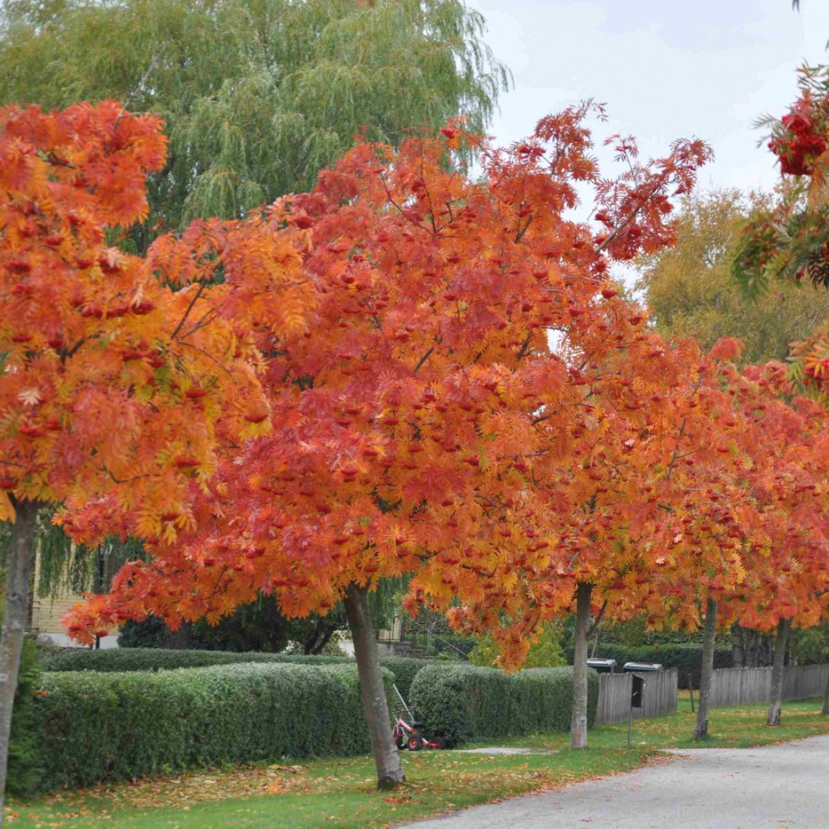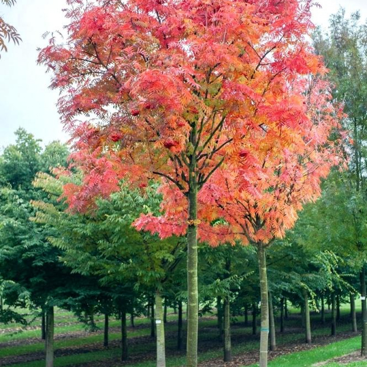 Компактное дерево с колонновидной кроной. Молодые саженцы отличаются узкой кроной, с возрастом она становится раскидистой и достигает 5м в диаметре. Декоративность заключается в окрасе листвы. Весной и летом листья зеленые, осенью приобретают огненно-красный оттенок с оранжевым отливом. Листья крупные, ажурные. Цветет белыми соцветиями. Зимой декоративна плодами. Солнце, полутень.