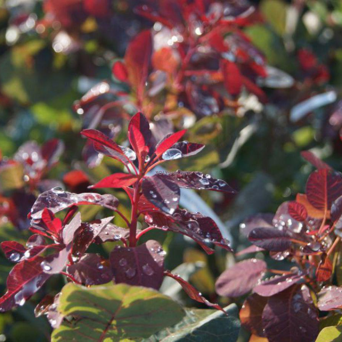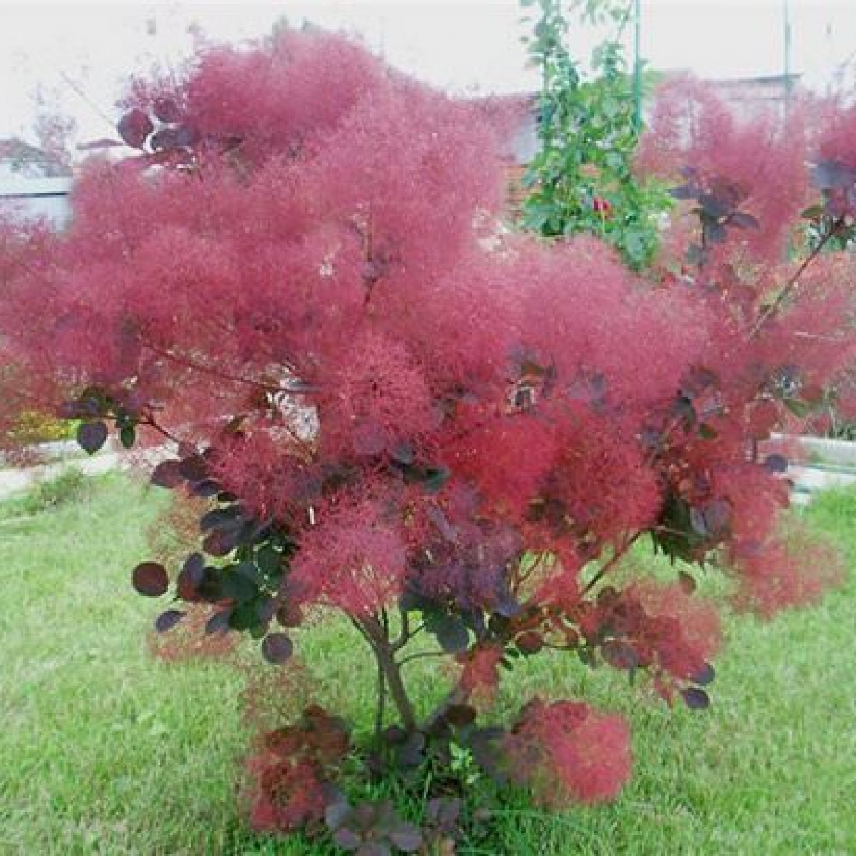 Кустарник высотой 2-3м. Декоративна широкой кроной с крупными темно-красными листьями и красными, пушистыми соплодиями. Цветет в июне-июле. Солнце.