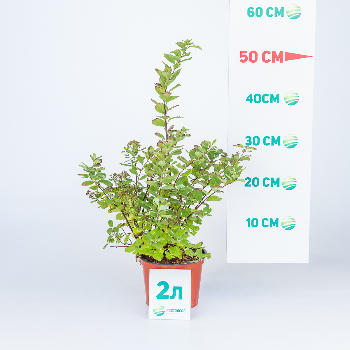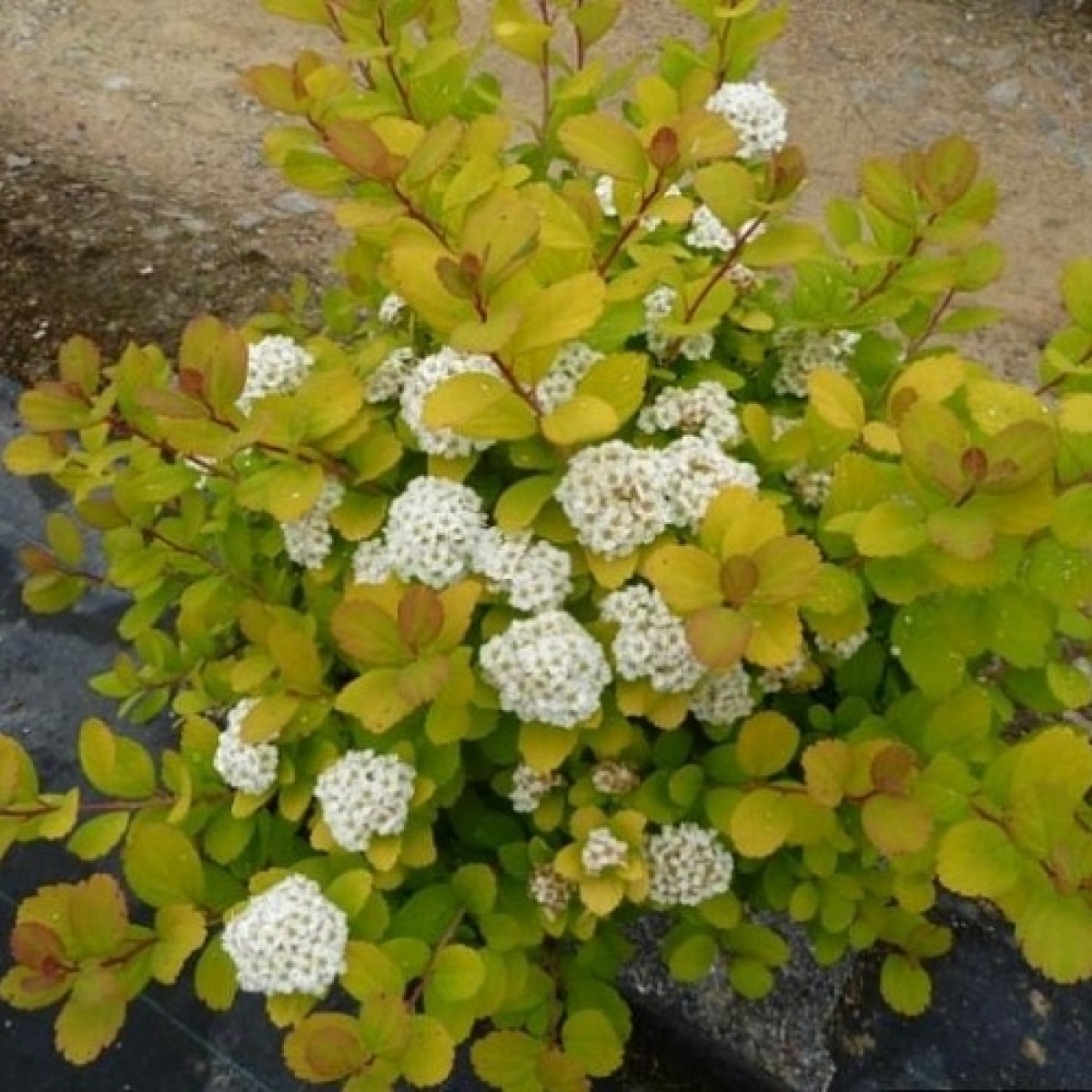 Карликовая спирея до 0,7м. Крона раскидистая, шаровидная. Листья золотисто-зелёные, осенью оранжево-красные. Цветки белые. Солнце.